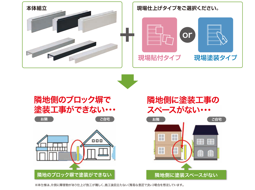 隣地境界線などの理由で表面仕上げを現地でしずらい場合には、パネルの片側を工場で塗装も可能です。