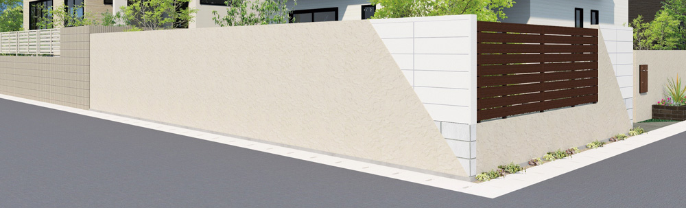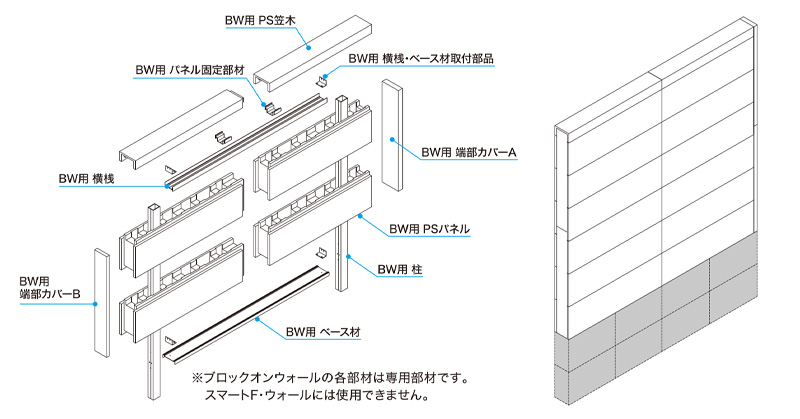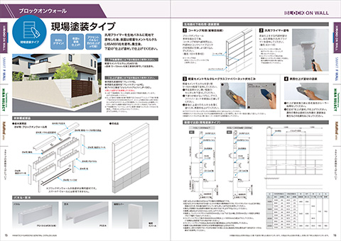 ブロックオンウォール現場塗装タイプ 汎用プライマーを生地パネルに現地で塗布した後、表面は軽量セメントモルタル(JISA6918)を塗布。養生後、下記の「仕上げ塗材」で仕上げてください。 四国化成建材社「パレットHG」・「パレットクリームHG」、アイカ工業社「ジョリパットアルファ(JP-100)」をご使用ください。 本体構成部品 パネル・笠木 パネル 笠木・柱キャップ 端部カバー ▼ 詳細はPDFファイルでご覧ください。