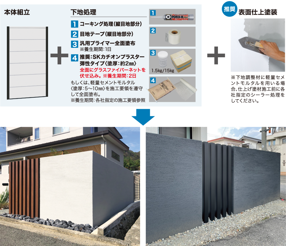 四国化成建材社「パレットHG」・「パレットクリームHG」、アイカ工業社「ジョリパットアルファ(JP-100)」をご使用ください。