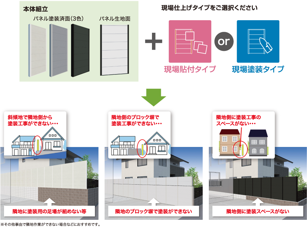 隣地境界線などの理由で表面仕上げを現地でしずらい場合には、パネルの片側を工場で塗装も可能です。